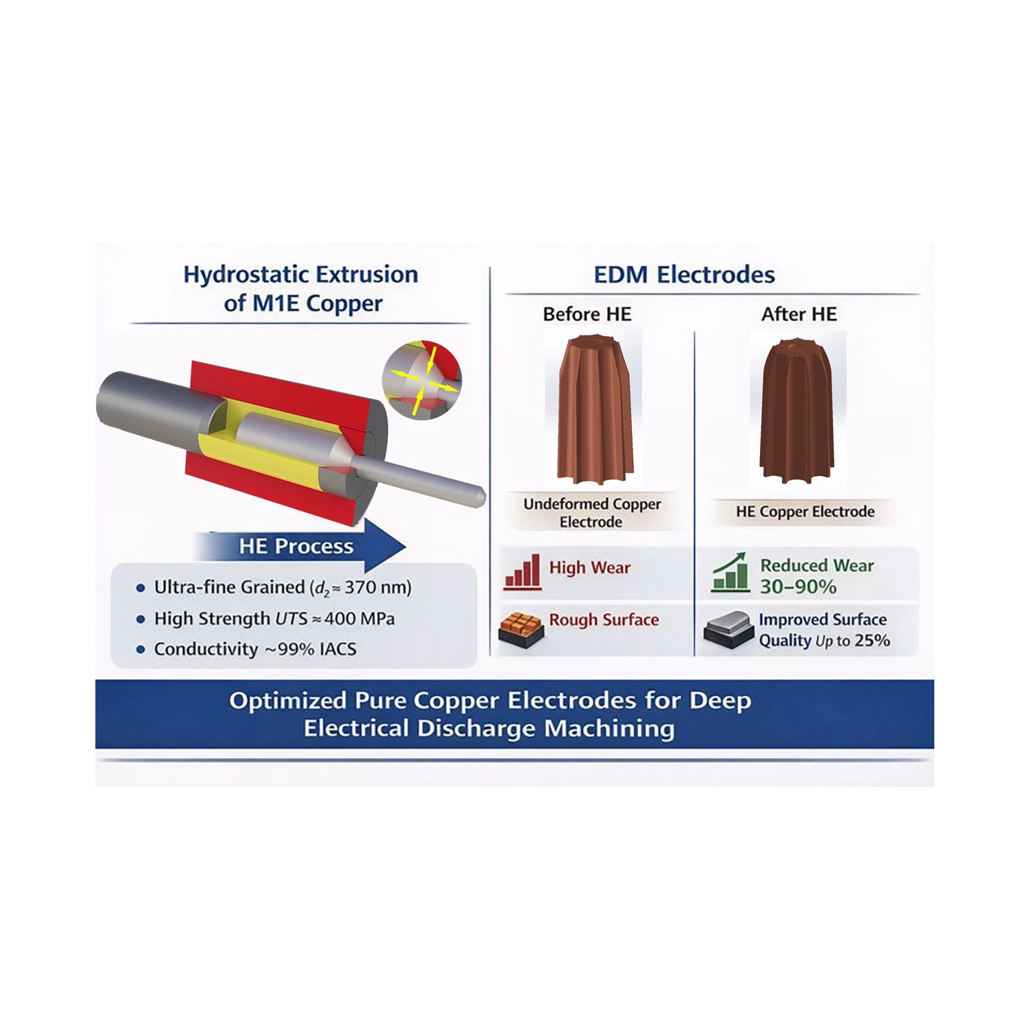 Szczegółowe wyniki w publikacji: Skiba, J.; Kulczyk, M.; Przybysz-Gloc, S.; Skorupska, M.; Kobus, M.; Nowak, K. Industrial-Scale Copper Wear Reduction in the Electrical Discharge Machining Through Hydrostatic Extrusion. Materials 2026, 19, 1314