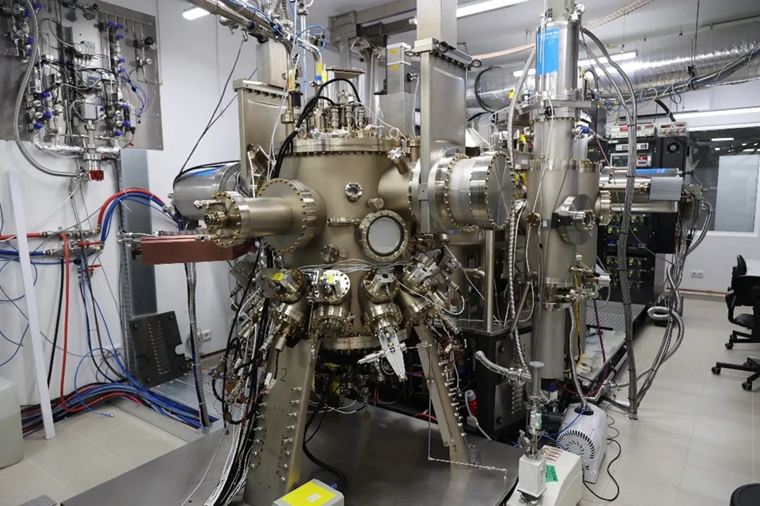 Epitaksja warstw materiałów azotkowych (In,Al,Ga)N domieszkowanych Mg, Si oraz Ge (poziomy domieszkowania sięgające 10^21 atomów/cm^2). Druga komora wzrostu podłączona próżniowo umożliwiająca epitaksję (Sc,Al,In,Ga)N oraz NbN. Podłoża do 4 cali. Laser reflectometry, RHEED.